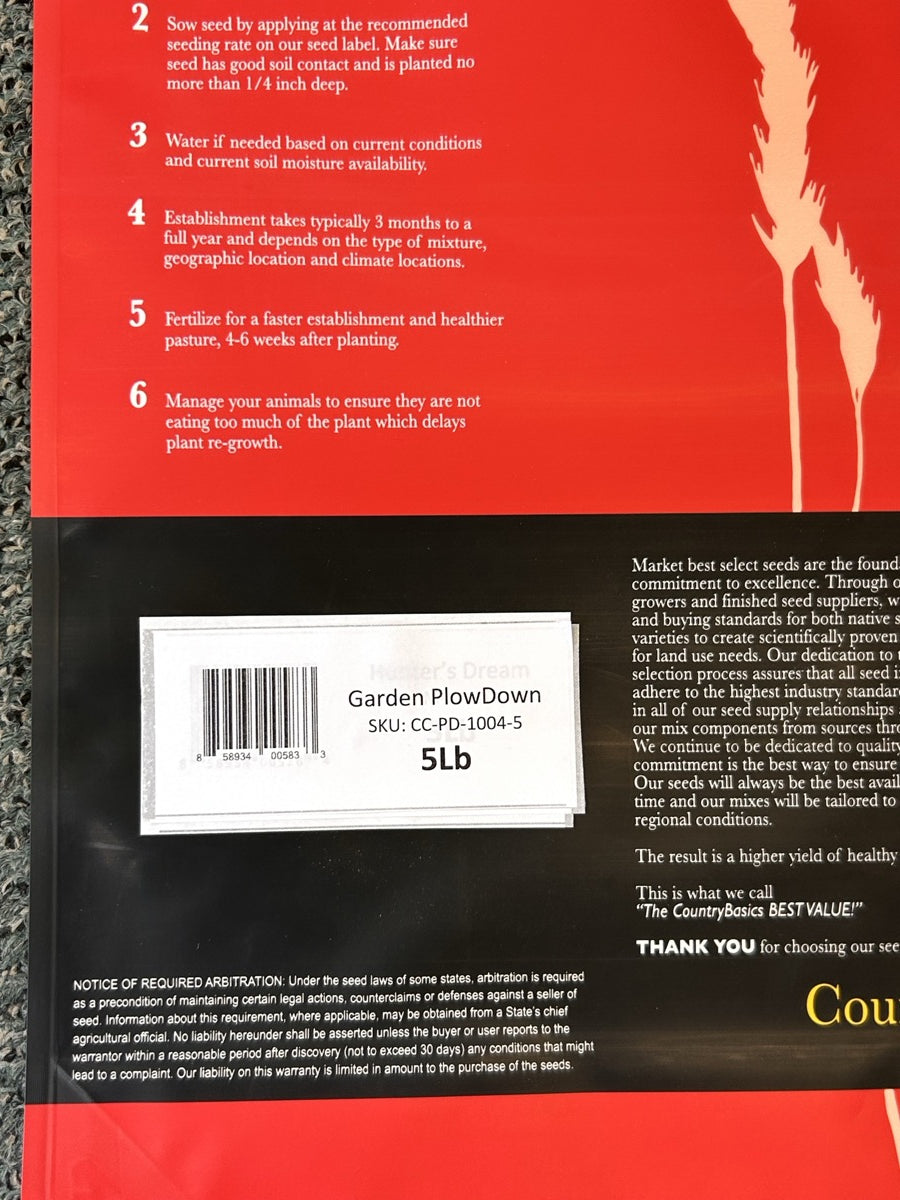 Our Garden Plow Down Cover Crop is ideal for green manure and soil building. This annual mix of legumes and cereal grains will provide fast growing ground cover, compete with weeds, and fix nitrogen in the soil. This mix should be tilled into the soil during the flowering stage before it goes to seed to prevent the plants from reseeding themselves.