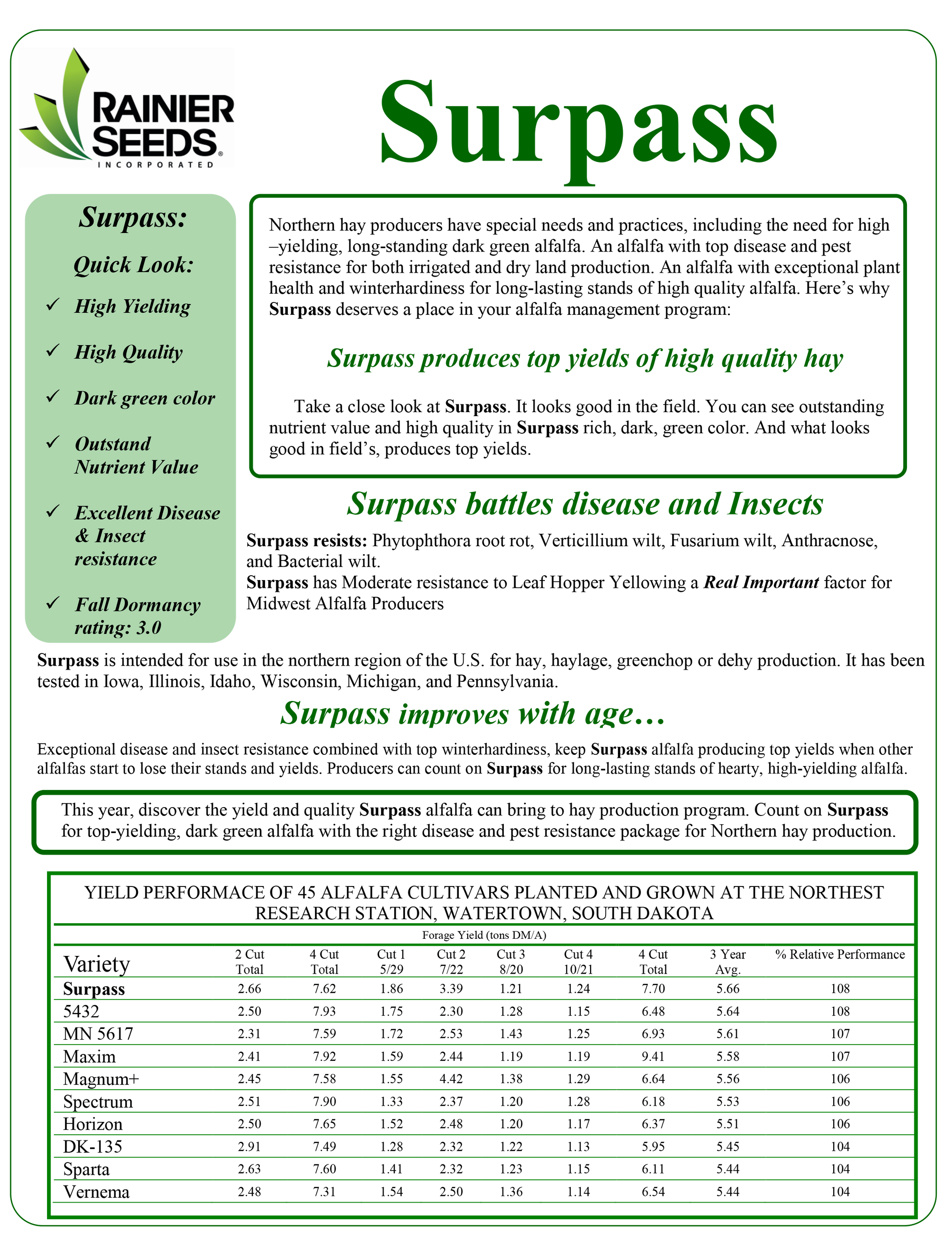 Specially designed for northern irrigated hay producers, Surpass is a high yielding, dark green, fine-stemmed alfalfa. Surpass exhibits top disease and pest resistance as well as winter hardiness for long-lasting stands of high-quality alfalfa.